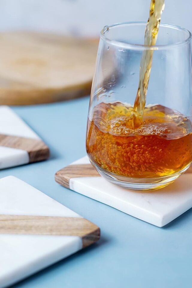 - ✨ WOODED MARBLE COASTERS : Coasters are perfect for placing beneath teacups, wine glasses, tumblers and mugs. The coasters are thick to completely shield the tabletop beneath them. This Heat Resistant Coaster Adds Style And Utility To Your Living Space Preventing Furniture Damages, Scratches On Glass, Water Marks And Stains On Wooden Tables, Absorbs Spills, Keeping Your Dining Table Cloth Clean And Complete In Looks.